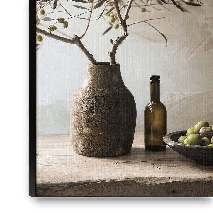 Cette nature morte artistique séduit par son élégance simple et sa beauté naturelle. Une branche d'olivier, ornée d'olives mûres, occupe le centre de l'image et lui confère un aspect calme et méditatif. La douceur des tons de terre et la composition minimaliste en font un décor parfait pour les intérieurs modernes et classiques. Une…
