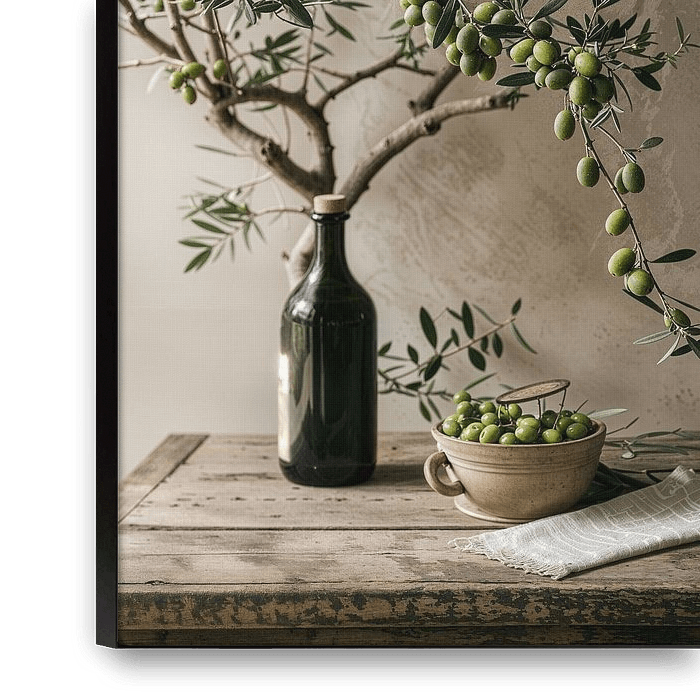 Cette nature morte artistique séduit par son élégance simple et sa beauté naturelle. Une branche d'olivier, ornée d'olives mûres, occupe le centre de l'image et lui confère un aspect calme et méditatif. La douceur des tons de terre et la composition minimaliste en font un décor parfait pour les intérieurs modernes et classiques. Une…