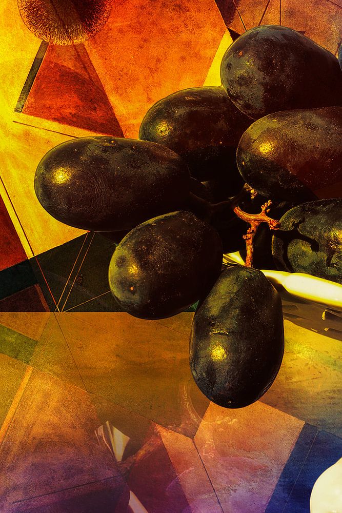 Nature morte avec des raisins et des carrés, à gauche et à droite, qui ensemble peuvent redevenir un tout. Les raisins sont posés sur une coupe à fruits dans un environnement abstrait et coloré avec une lumière spéciale. Cette œuvre abstraite est très colorée, rouge, jaune, orange, bleu, violet, rose, aubergine, dans de nombreuses nuances. Bref, une nature morte classique, et pourtant pas de la même manière.