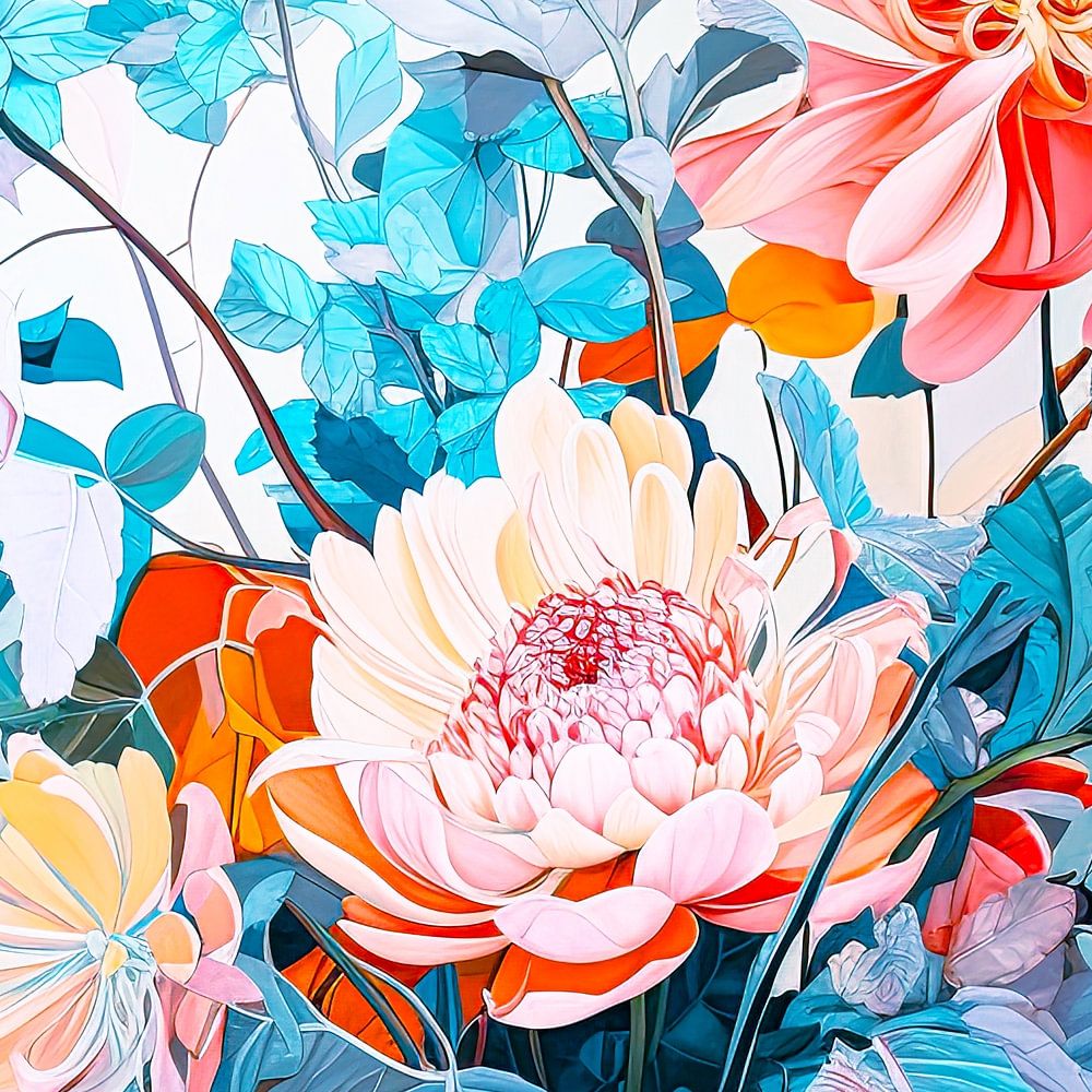 Ce tableau carré capture la beauté des fleurs dans cette œuvre d'art contemporaine et décorative. La palette de couleurs inhabituelle, qui met l'accent sur le bleu aqua, le jaune et l'orange, crée un effet visuel vif et vibrant. Cette œuvre d'art moderne est un excellent choix pour ceux qui recherchent un ajout vibrant et sophistiqué à leur intérieur. Avec sa palette de couleurs expressives et son approche contemporaine des fleurs, ce tableau apporte une atmosphère estivale fraîche et vibrante à n'importe quel espace.
