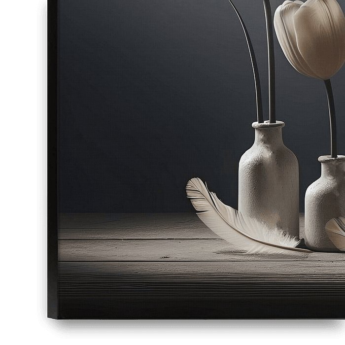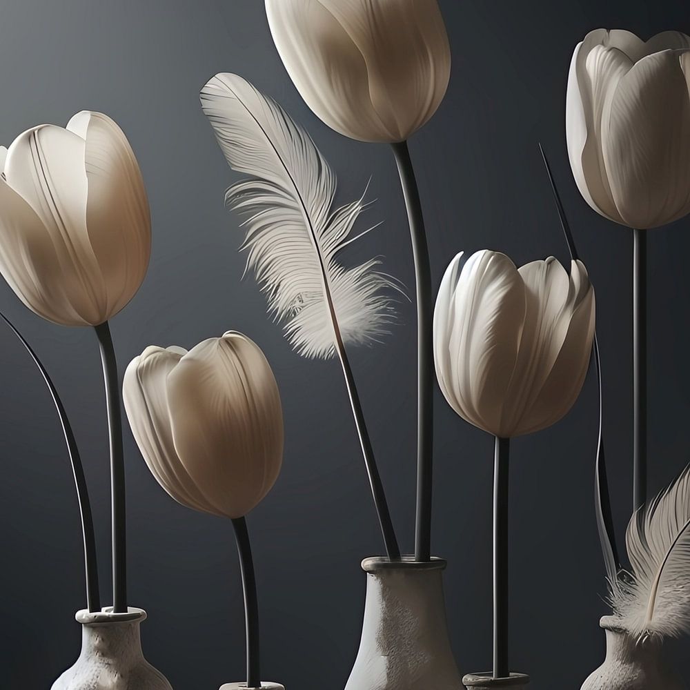 nature morte, tulipes, plumes, minimaliste, tranquillité, douceur, équilibre, poésie, nature, céramique, tons neutres, beaux-arts, botanique, élégant, art contemporain, art mural, intérieur, sérénité, ombre et lumière, scandinave. Influences wabi-sabi, ton-sur-ton, gris, noir, champagne, crème, tons de terre,