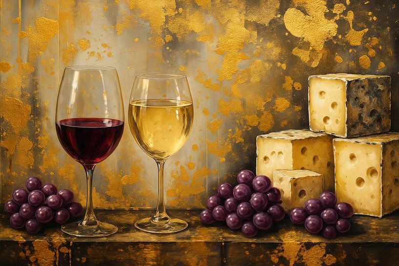 Deux verres à vin, l'un rouge et l'autre blanc, se trouvent à côté de piles de fromage à trous ronds et de grappes de raisin violettes. Des éclats d'or chauds dansent sur un fond usé par le temps, donnant à la nature morte un éclat et une profondeur riches. La transparence du verre contraste magnifiquement avec la texture mate du…