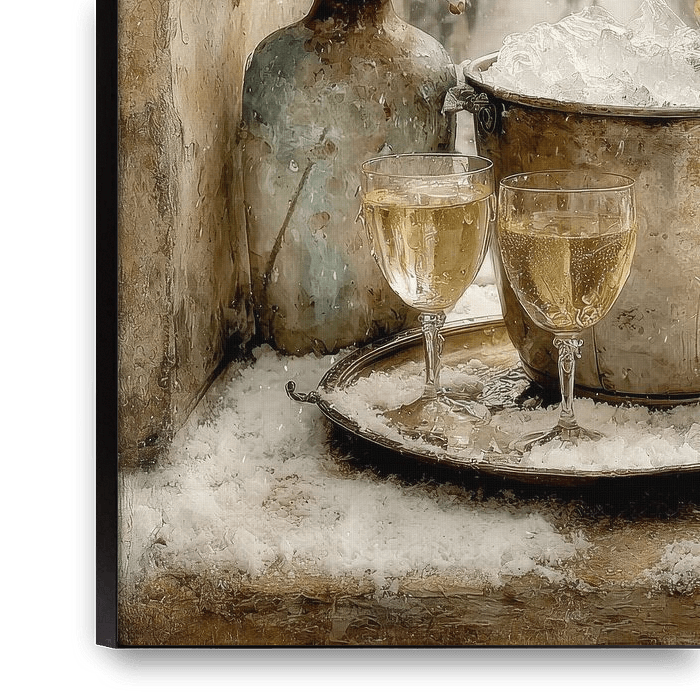 Mots clés : nature morte festive au champagne, décoration hivernale, décoration murale intemporelle, peinture poétique, art atmosphérique, peinture nostalgique, peinture élégante, Joriali Photography and Paintings, verres, neige, style de vie classique, style de vie romantique, style de vie wabi-sabi, salon, salle à manger, cuisine