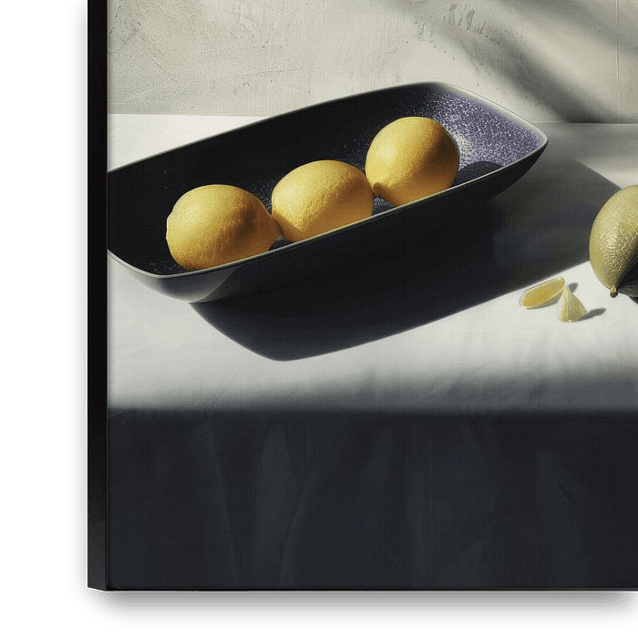 Nature morte, jeu d'ombre et de lumière. Une nature morte moderne avec des citrons. Choisissez la taille et le matériau de cette œuvre et faites-en un véritable accroche-regard pour votre intérieur.
