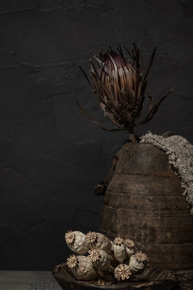 Nature morte rurale avec une vieille cruche et une vieille cuillère en bois. L'ensemble est posé sur une vieille table en bois d'échafaudage. C'est une nature morte sombre avec une belle lumière douce provenant d'une fenêtre. Dans la vieille cuillère en bois se trouve un bouquet de bulbes de pavot séchés. Et dans le vieux pichet en bois se trouve une fleur séchée de Protea/forêt de sucre. Une étoffe en lin est suspendue au bord de la jarre. Il s'agit d'une image calme avec des tons de couleurs sobres. En tant que décoration murale, ce tableau s'intègre bien dans un intérieur rural et naturel. Il existe également une version horizontale de cette nature morte.