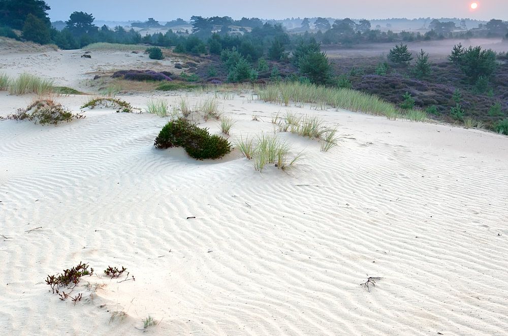 Misty sunrise over sand dunes and hills with flowering heather. Drents-Friese wold, Drenthe, Friesland, the Netherlands