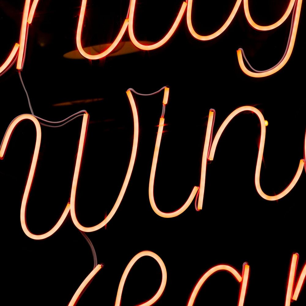 Un éclairage au néon orange. Bar à vin Antiga. De belles lettres élégantes