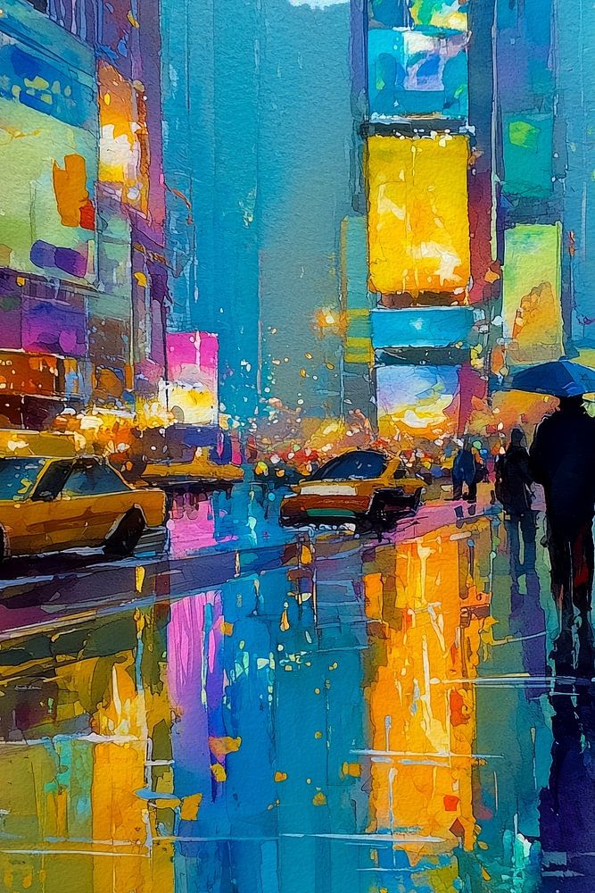 Capturez la magie unique de New York avec cette peinture étonnante qui donne vie à l'atmosphère emblématique de la ville qui ne dort jamais. Les publicités lumineuses aux couleurs vives, l'animation de Times Square et les reflets chatoyants de la pluie créent une image dynamique et énergique qui rappelle instantanément le cœur animé de Manhattan.