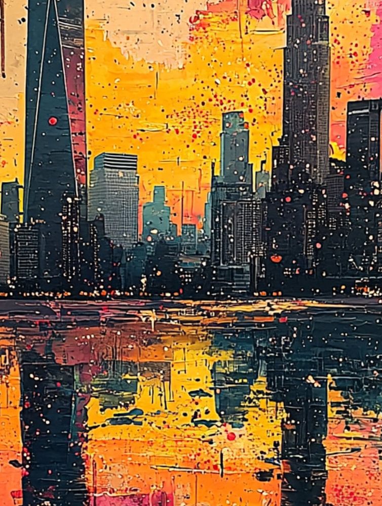 Le tableau représente la ligne d'horizon de New York dans des couleurs vibrantes et impressionnistes. Les tours et les gratte-ciel s'élèvent en touches dynamiques de rose, de jaune soleil et d'orange. La ville semble vibrer d'énergie, capturée par la lumière et la couleur. Le ciel brille dans des nuances d'orange et de rose, tandis que l'eau, au fond de l'eau, reflète les bâtiments et la lumière dans des mouvements de balayage. L'ensemble semble vivant, puissant et plein d'espoir - une ville qui ne dort jamais, capturée en couleurs.