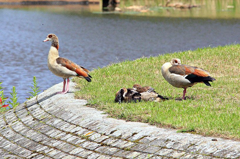 Achetez cette œuvre d'art d'oiseau Nijlganzen echtpaar met 2 kuikens par Gijs Tjeerdsma sur toile, aluminium, ArtFrame ou photographie (encadrée), impression d'art en haute qualité et tout format.