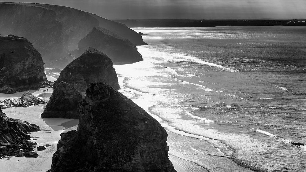 Menacer image en noir et blanc de la côte dans le sud ouest de l'Angleterre. La photo a été prise à la Bedruthan steps du chemin de la côte sud-ouest.
