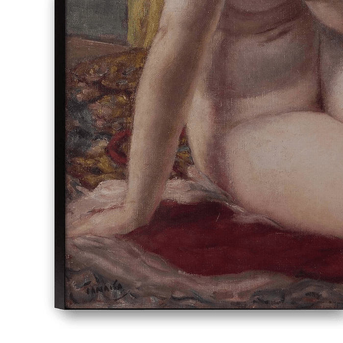 Le modèle nu est assis nu sur le sol. La femme du portrait nu est assise sur une hanche et tient son collier de perles dans sa main. Les jambes, les hanches et le ventre de la jeune fille sont nus. Les seins et les épaules sont également dénudés.