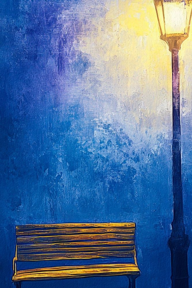 Un banc solitaire sous la lumière mystérieuse d'une lanterne qui brille d'un éclat chaleureux, tandis que l'arrière-plan froid scintille dans des tons bleus profonds. Ce décor respire le calme et la mélancolie, idéal pour une chambre à coucher ou un salon cosy où il apporte une touche de convivialité et de recueillement.