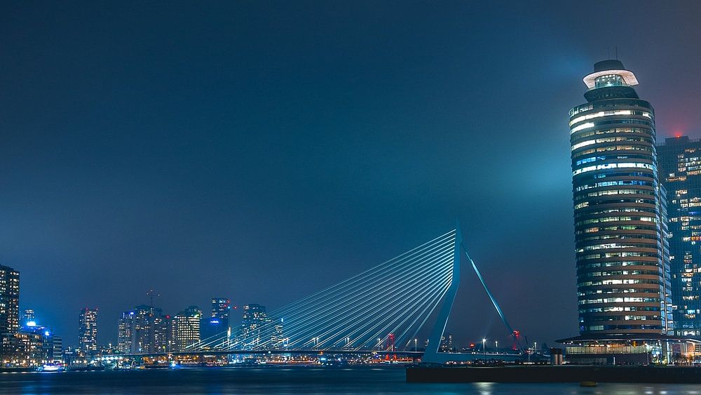 La ligne d'horizon illuminée de Rotterdam le soir. Avec un peu de brouillard à ras de terre, le spectacle de lumière est magnifique.