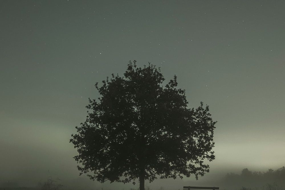 Au milieu de la nuit, j'étais là, à attendre les aurores boréales annoncées. Cette aurore boréale n'est pas venue, parce que la nature ne peut pas être prédite. Tout comme je ne pouvais pas prévoir l'apparition soudaine de grandes étendues de brouillard au sol. C'est beau à voir. J'ai vu cet arbre avec le banc abandonné et un ciel étoilé. Je n'ai pu que retourner mon appareil photo sur un trépied pour en prendre une belle photo sereine. Avec une vitesse d'obturation légèrement plus lente, cette photo a été prise, ce n'est certainement pas une photo en noir et blanc, mais la couleur a été enlevée de cette photo pour la rendre encore plus belle et sereine. Une belle photo, si je puis dire.