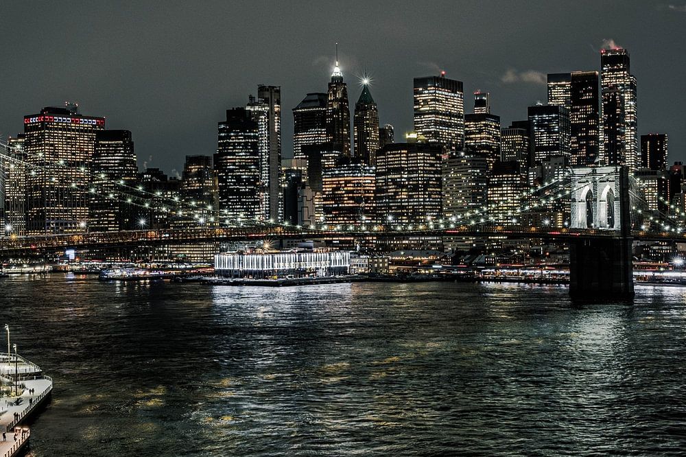 Le pont de Brooklyn la nuit - vu de Brooklyn, avec l'horizon scintillant du centre-ville de Manhattan en arrière-plan. Les lumières de la ville se reflètent dans l'eau, tandis que les emblématiques câbles d'acier du pont traversent le ciel nocturne de la ville. Un regard intemporel sur la magie de New York au coucher du soleil.