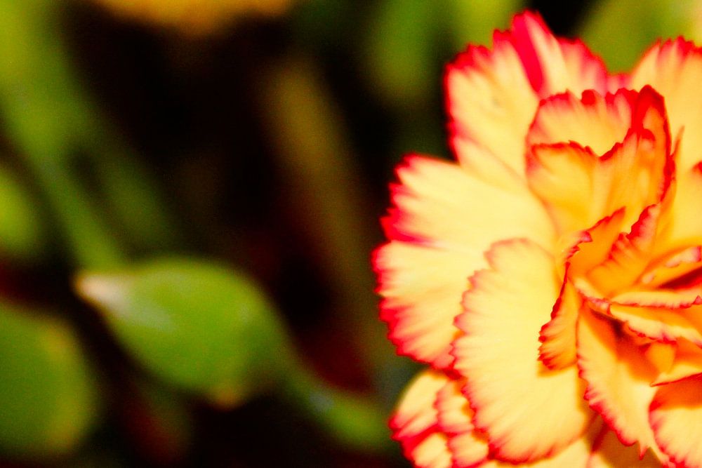 Oeillet jaune rouge sur fond vert foncé. Des contrastes nets et des couleurs vives.