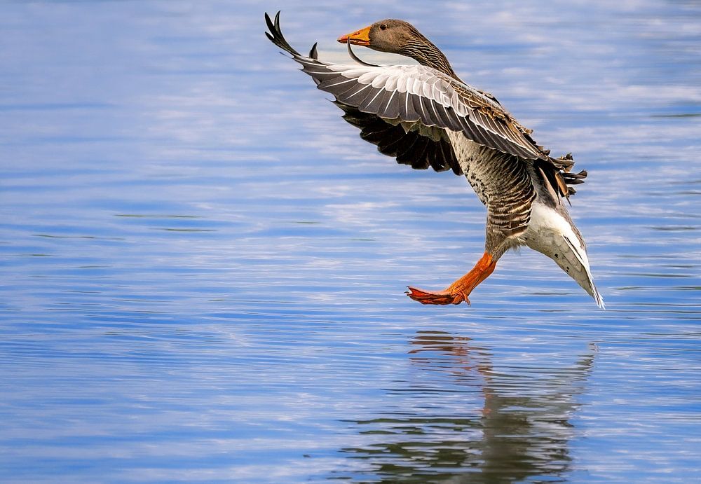 Oie cendrée en phase d'atterrissage au-dessus de l'Altmühlsee