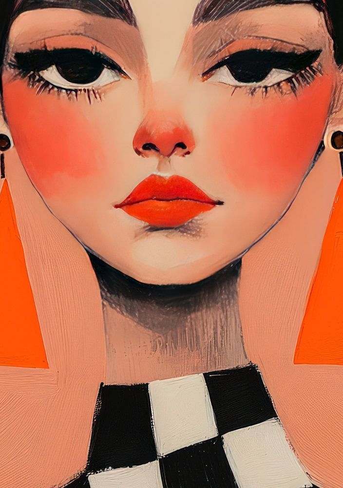 La palette de couleurs combine le noir et le blanc pour les vêtements, l'orange pour les accessoires, le rose pour l'arrière-plan et les tons rouges pour les lèvres et les joues. Le style est illustratif et décoratif, avec des influences du portrait de mode. Les lignes sont nettes mais manuelles, et les couleurs sont appliquées de manière uniforme et opaque, sans mettre l'accent sur la profondeur ou l'ombre. L'œuvre montre des traits humains reconnaissables sans rechercher le réalisme.