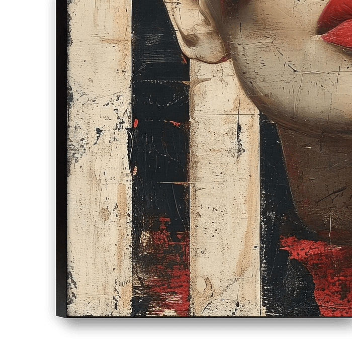 Achtergrond en materiaalgebruik ondersteunen die twee hoofdelementen zonder te storen. Verticale, afgewisselde banen van zwart en crème vormen een gestileerde achtergrond, licht verweerd en met zichtbare penseel- en paletmesstructuren. De artiest werkt met meerdere verflagen: transparante glacis naast dekkende pigmentvlakken, krassen en subtiele vegen. Daardoor voelt dit portret schilderij zowel hedendaags als archaïsch — een moderne glamour gevat in een ruwe, bijna oudere textuur. Alles wijst op een bewuste keuze voor contrast: rood tegen zwart, gladheid tegen ruwheid, anonimiteit tegen expressie.