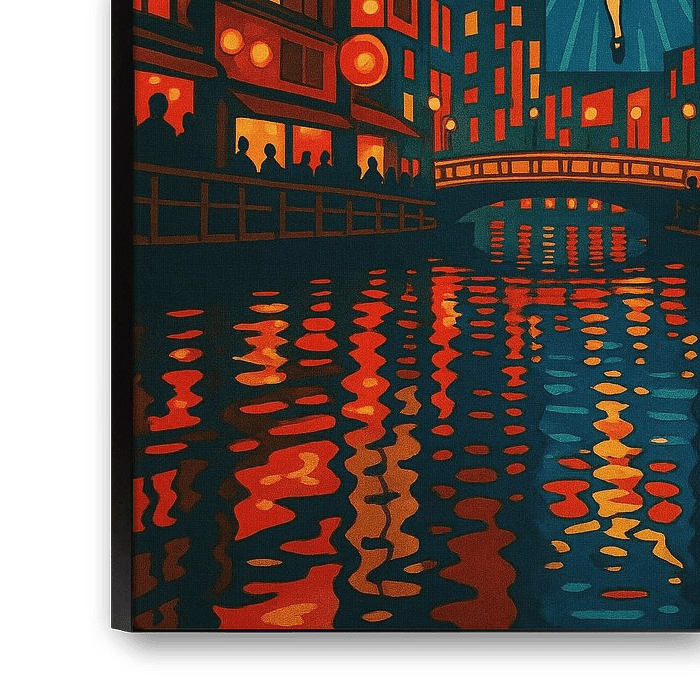 La composition utilise des angles ascendants et des bâtiments superposés pour exprimer la densité et le dynamisme de la ville. Chaque signe, reflet et façade de bâtiment est rendu avec des formes stylisées propres qui font écho à l'aspect des affiches de voyage vintage tout en conservant une énergie japonaise moderne. La rivière agit comme une ligne directrice, attirant le spectateur directement au cœur de la ville, où l'effervescence règne après la tombée de la nuit. Ce mélange de couleurs vives, de lignes nettes et de reflets lumineux rend l'œuvre visuellement immersive et émotionnellement stimulante.