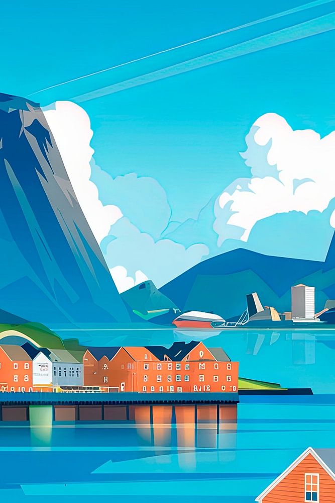 Dans un ciel d'un bleu éclatant, la pittoresque Oslo déploie ses bâtiments colorés au bord de l'eau, encadrés par d'imposantes montagnes. Ce paysage harmonieux allie nature et architecture de manière fascinante, tandis que de douces vagues viennent caresser les maisons colorées de la côte. Accueillant et vivant, ce motif incarne le charme de la Norvège !
