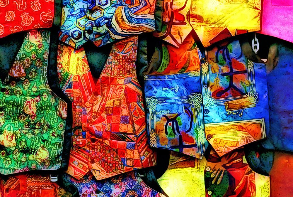 Mur de gilets colorés dans un kiosque à Londres, Angleterre