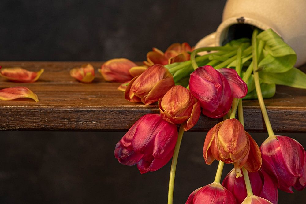 Le vase de tulipes tombé. Un véritable archétype de la scène néerlandaise. Des tulipes colorées qui ont fini de fleurir. La lumière douce fait ressembler cette photo à une peinture. Quelque chose que les gens avaient l'habitude de faire, pas prendre une photo mais peindre la nature morte. À l'époque moderne, nous en faisons une photo, bien que nous aimions utiliser la même lumière que celle utilisée à l'époque. En regardant beaucoup les peintures du passé, j'ai commencé à imiter cette lumière. Le vieux bocal dans lequel les tulipes étaient placées joue bien sûr un rôle important. Vous pouvez également voir une cruche similaire dans la célèbre laitière de Johannes Vermeer.