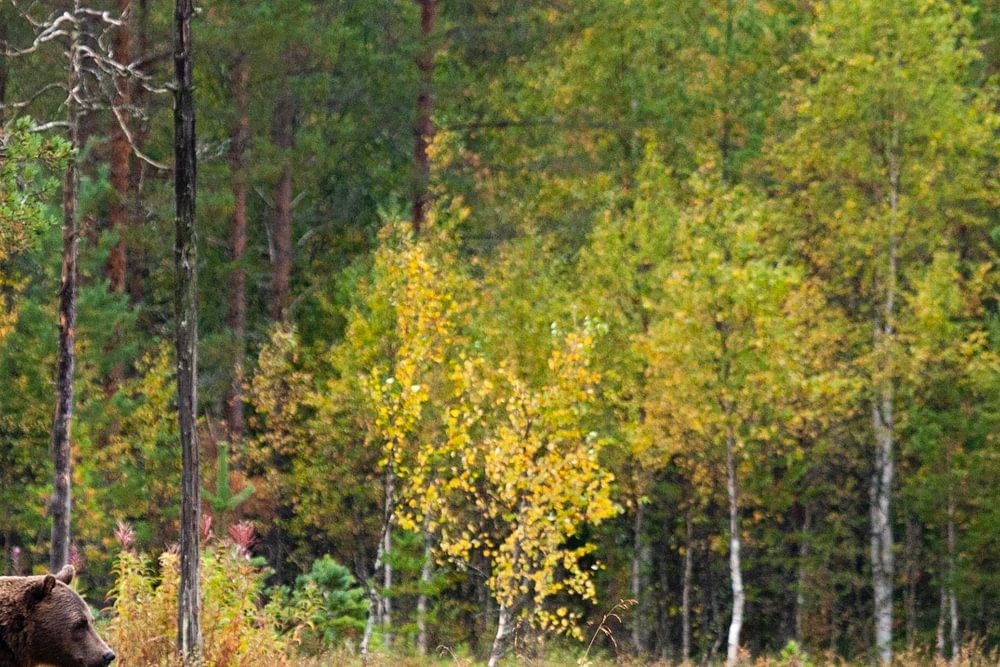 Lors de notre voyage en Finlande, en Scandinavie, nous avons photographié des ours bruns depuis une cachette. Les ours se sont approchés très près de la cachette, ce qui nous a permis de prendre de superbes photos des ours bruns, comme ce beau spécimen à la fourrure partiellement blonde. Cette différence de couleur est très rare. On l'appelait en plaisantant l'ours duopenotti. Dans cette photo, j'ai photographié l'ours plutôt dans le paysage avec ses couleurs d'automne. Joli aussi avec la corneille pie au premier plan.