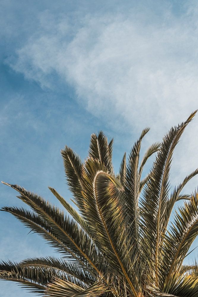 Cette photo sereine montre les feuilles majestueuses d'un palmier s'étirant vers un ciel bleu et clair, les rayons dorés du soleil brillant doucement à travers les feuilles. Les contrastes subtils entre les feuilles vertes et le ciel créent un sentiment de tranquillité et de chaleur tropicale. Cette image capture parfaitement l'essence d'une journée ensoleillée et ferait un merveilleux accent dans une pièce à l'intérieur décontracté ou naturel.