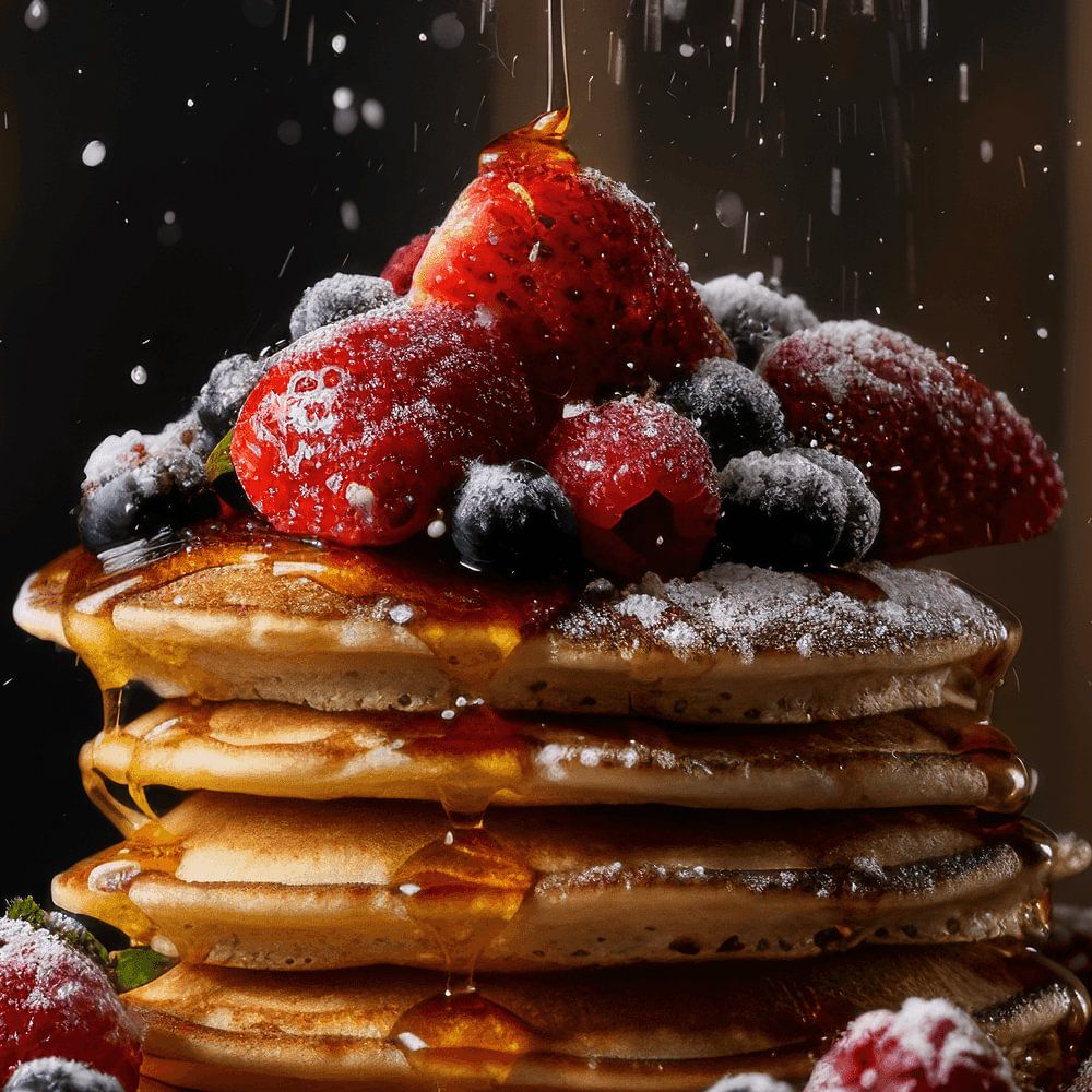 Ce tableau vivant montre des crêpes parfaitement préparées, décorées d'une généreuse portion de baies fraîches et d'un trait de sirop. L'effet détaillé de sucre glace et les couleurs réalistes en font une pièce de décoration exceptionnelle pour les cuisines et les salles à manger. Un must pour les gourmands et les amateurs de décors de cuisine élégants.