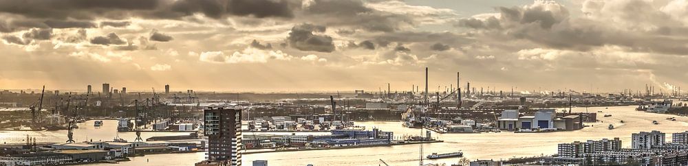 Il y a beaucoup à voir sur ce panorama composé de cinq photos différentes. De gauche à droite, le port et les zones industrielles de Waalhaven, Heijplaat, Shell Pernis, Botlek et Europoort, entre autres. En arrière-plan les tours résidentielles de Hoogvliet et Spijkenisse et même les éoliennes à Haringvliet. Au premier plan les quartiers de Lloydkwartier, Schiemond et Delfshaven. La rivière Nieuwe Maas serpente jusqu'à la mer, reliant tout cela. Et au-dessus de toute la scène, il y a un ciel dramatique.