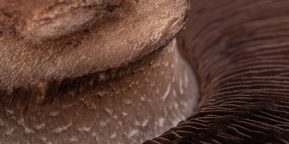 sujet / association : cuisine / nourriture / portobello / champignon / abstrait / moderne / champignon de Paris / nature / macro / macrophotographie / naturel / lignes / motif / structure / panorama (Cette image a été recadrée au format panoramique)