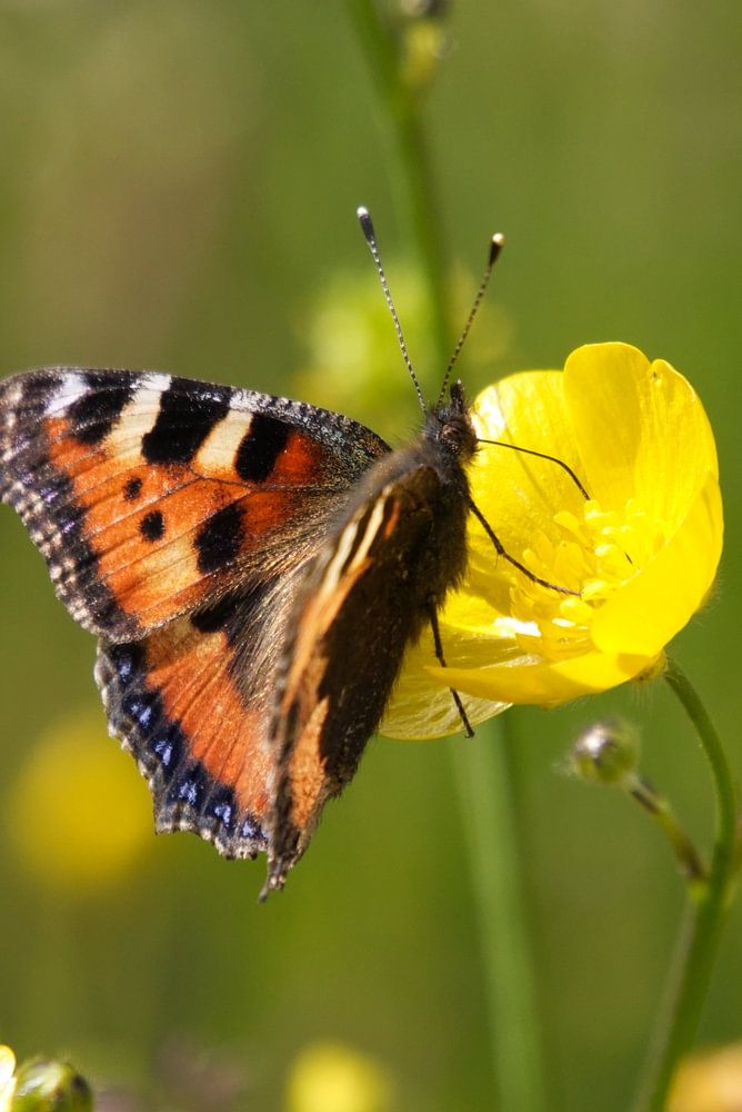 Lors d'une promenade à la campagne, j'ai suivi pendant un moment ce beau papillon Atalante, qui voltigeait de bouton d'or en bouton d'or. Les couleurs vives, le jaune du bouton d'or, le vert de l'herbe et l'orange du papillon donnent à l'image une sensation agréable et fraîche d'été/printemps.