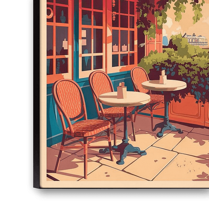 Un café enchanteur sous des plantes en fleurs fait le lien avec l'élégance pétillante de la ville de l'amour. La silhouette majestueuse de la Tour Eiffel se dresse en arrière-plan, tandis que de doux nuages complètent parfaitement l'atmosphère céleste. Un lieu où chaque gorgée de café rapproche un peu plus de l'âme de Paris.