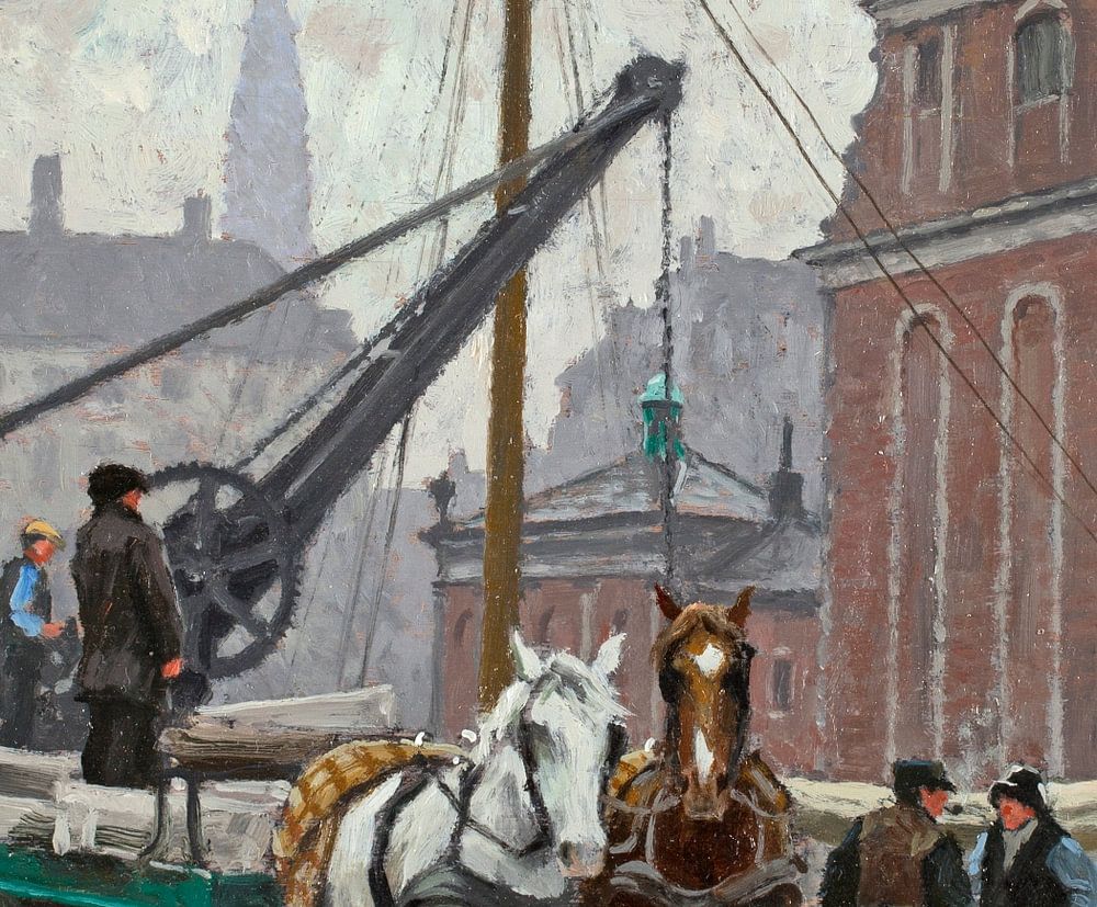 Dans ce paysage urbain, un cheval et une charrette se tiennent près d'une grue, une grue portuaire chargeant et déchargeant un navire dans un canal. Les dockers se tiennent autour pour discuter de la scène.