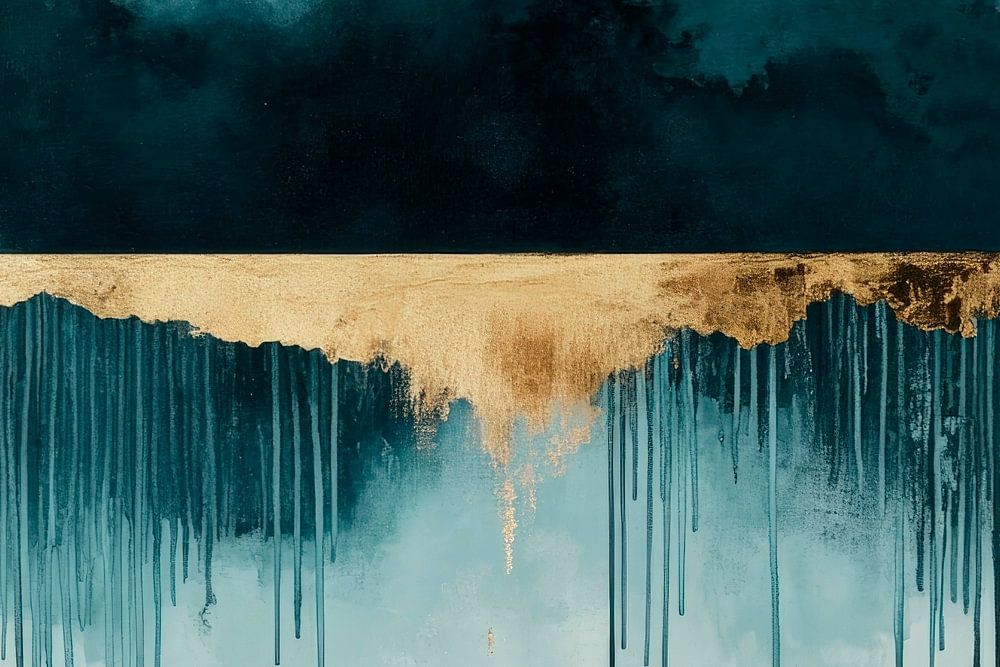 Une interaction de bleus profonds et orageux et de dorures délicates crée un accent dramatique. D'élégantes gouttes semblent s'écouler de la formation nuageuse, comme si elles étaient en mouvement. Parfaite pour le salon, cette œuvre d'art confère à la pièce une atmosphère mystique et contemporaine qui invite à la rêverie.