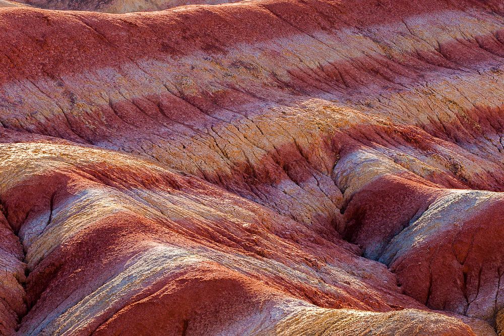 La photo montre un paysage coloré de couleurs rouges avec des collines fortement érodées au lever du soleil. La photo a été faite près de Zhangye dans la province du Gansu en Chine