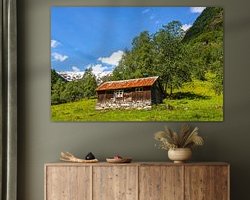 Achetez cette œuvre d'art de paysage Paysage avec une cabane en bois à Fjærland, Norvège par Rico Ködder sur toile, aluminium, ArtFrame ou photographie (encadrée), impression d'art en haute qualité et tout format.