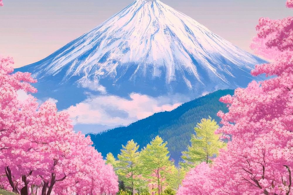 Un chemin en pente douce serpente entre de magnifiques fleurs de cerisier, dont le rose éclatant baigne le paysage d'une lumière féerique. En arrière-plan se dresse majestueusement le sommet enneigé d'un volcan, dont la présence silencieuse parachève l'instant magique. Ici, la nature et les rêves s'unissent pour former un chef-d'œuvre harmonieux.