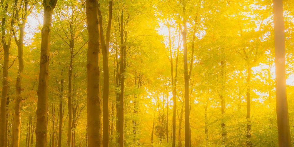 Paysage de hêtraie d'automne avec des feuilles brunes et dorées qui ont recouvert le sol lors d'une belle journée d'automne en Gelderland, Pays-Bas.