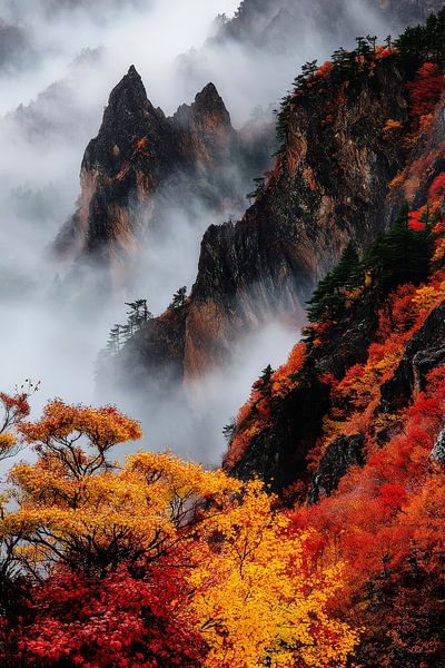 Un véritable jeu de couleurs se déploie dans cette image aux tons automnaux lumineux qui encadrent les montagnes majestueuses. La scène recouverte de brume incite à la rêverie et transmet un calme relaxant. Idéal pour le salon, où il dégage chaleur et convivialité et confère à chaque pièce une note harmonieuse.