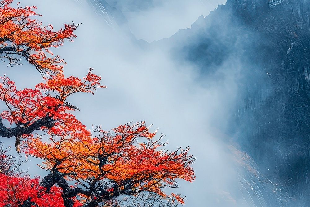 Des montagnes enveloppées de brume se dressent majestueusement, tandis que des arbres rouge-orange lumineux forment un contraste fascinant. Cette combinaison harmonieuse de nature et de mysticisme crée une atmosphère apaisante, parfaite pour une chambre à coucher ou un salon, où elle apporte calme et inspiration.