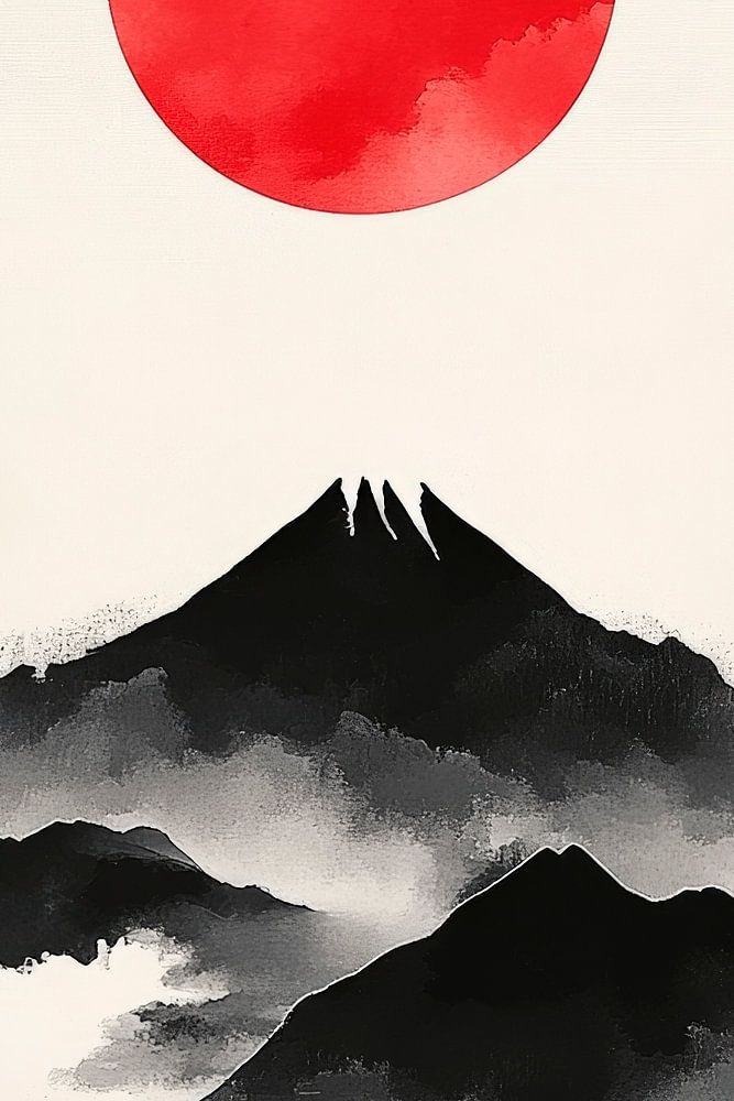 Un jeu puissant de rouge et de noir se déploie dans cette œuvre artistique. La boule de soleil rayonnante plane majestueusement au-dessus de douces montagnes mystiques, enveloppées d'une douce brume. Ce tableau confère à chaque pièce une élégance et un calme asiatiques, idéal pour le salon ou la chambre à coucher, où il favorise les moments de méditation.