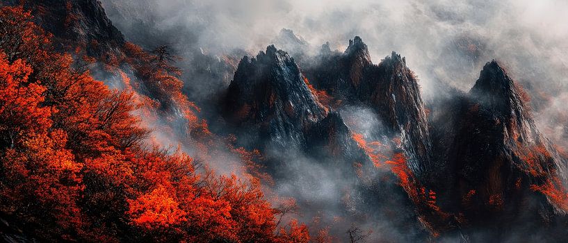Un jeu fascinant de rouge et de gris se déploie ici, tandis que des feuilles d'automne lumineuses rencontrent des sommets de montagne dramatiques, enveloppés de brouillard. Ce décor mystique éveille des envies d'aventure dans la nature et apporte une élégance apaisante dans chaque salon, où il sert de point de mire et de sujet de…