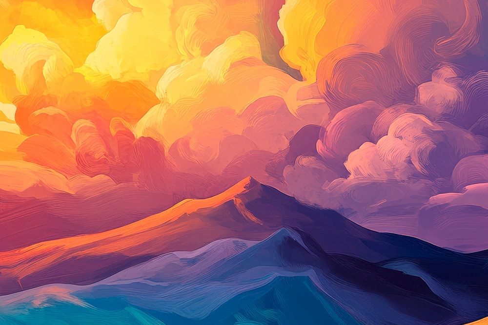 Avec des couleurs vives, un paysage de rêve se déploie, où de douces collines et de majestueuses montagnes s'élèvent vers le ciel. Le coucher de soleil plonge les nuages dans des tons chauds et vivants, créant une atmosphère de calme et d'inspiration. Cette œuvre d'art s'harmonise parfaitement dans le salon, anime la pièce et invite à la contemplation.