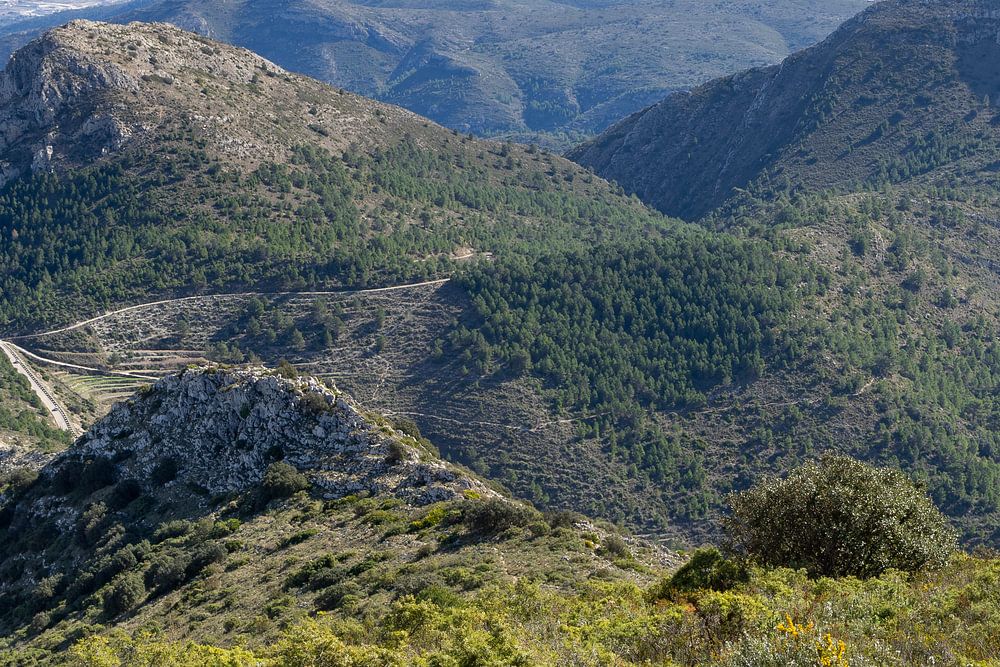 Ce paysage de montagne est dédié à la Sierra del Carrascal de Parcent et à la belle nature proche de la côte méditerranéenne. Un sentier traverse la crête, offrant de magnifiques vues sur les montagnes et les vallées environnantes. Le sommet de la Penya Talai attire le regard dans ce vaste paysage. Au loin, on aperçoit la Méditerranée. Les versants verts des montagnes rencontrent les tons bleus de la côte méditerranéenne.