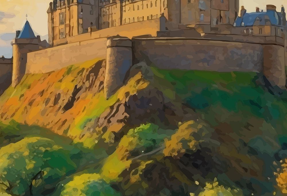 Le château d'Édimbourg couronne son perchoir rocheux, encadré par un doux ciel écossais brossé dans des gris, des bleus et des ors chauds. Les traits impressionnistes donnent de la texture aux anciens murs de pierre, tandis que la ville en contrebas bourdonne dans des tons sourds. Une scène riche en histoire, en atmosphère et en force tranquille.
