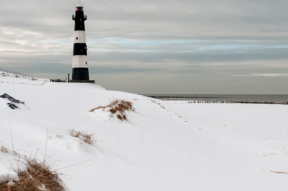 Image d'hiver unique en Zeeuws-Vlaanderen du phare de Nieuwe Sluis à Breskens. Il est rare de pouvoir admirer le phare en fonte noir et blanc dans un paysage enneigé. Le Westerschelde en arrière-plan.
