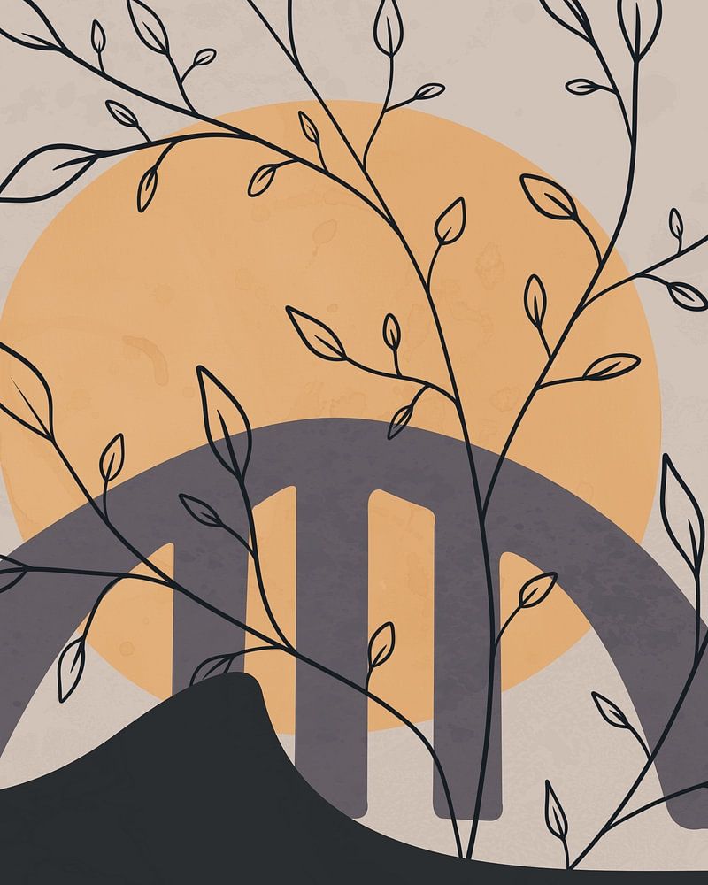 Paysage minimaliste avec un dessin au trait à l'encre gris foncé d'une plante avec de petites feuilles, poussant près d'un petit lac. Derrière le lac, on peut voir un pont gris avec un soleil du soir jaune foncé. L'arrière-plan est gris clair. L'illustration est peinte à l'aquarelle avec une texture visible.